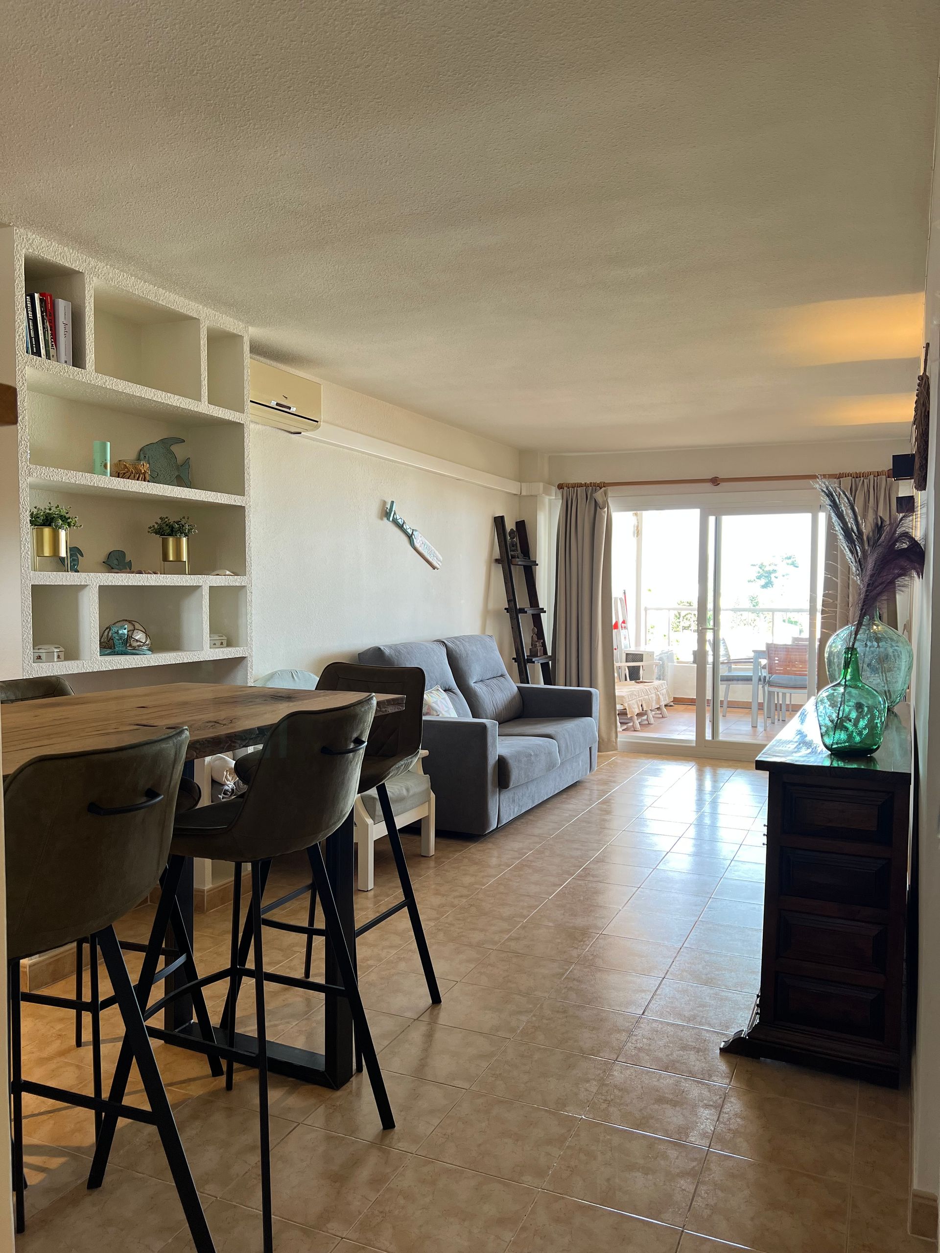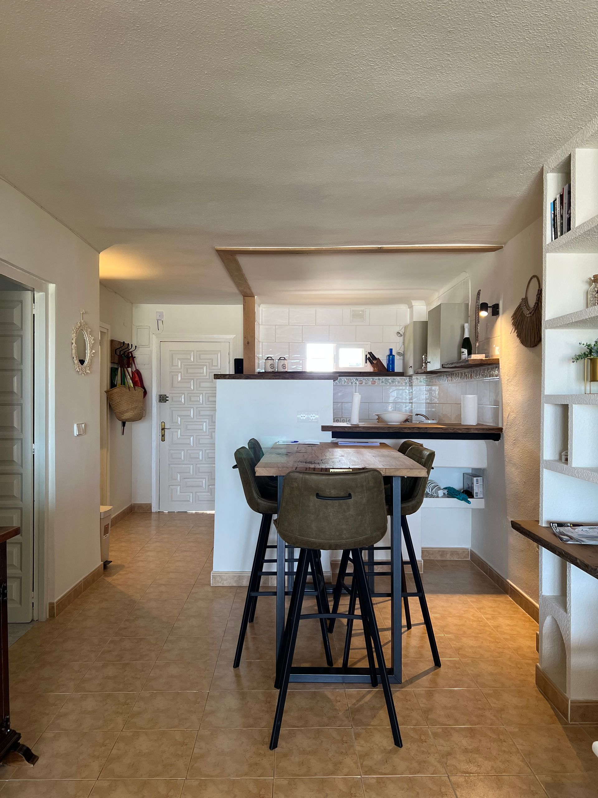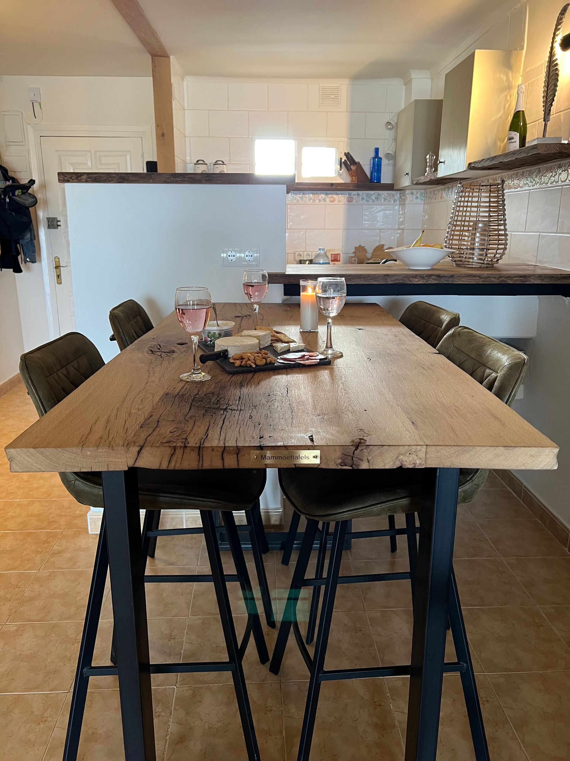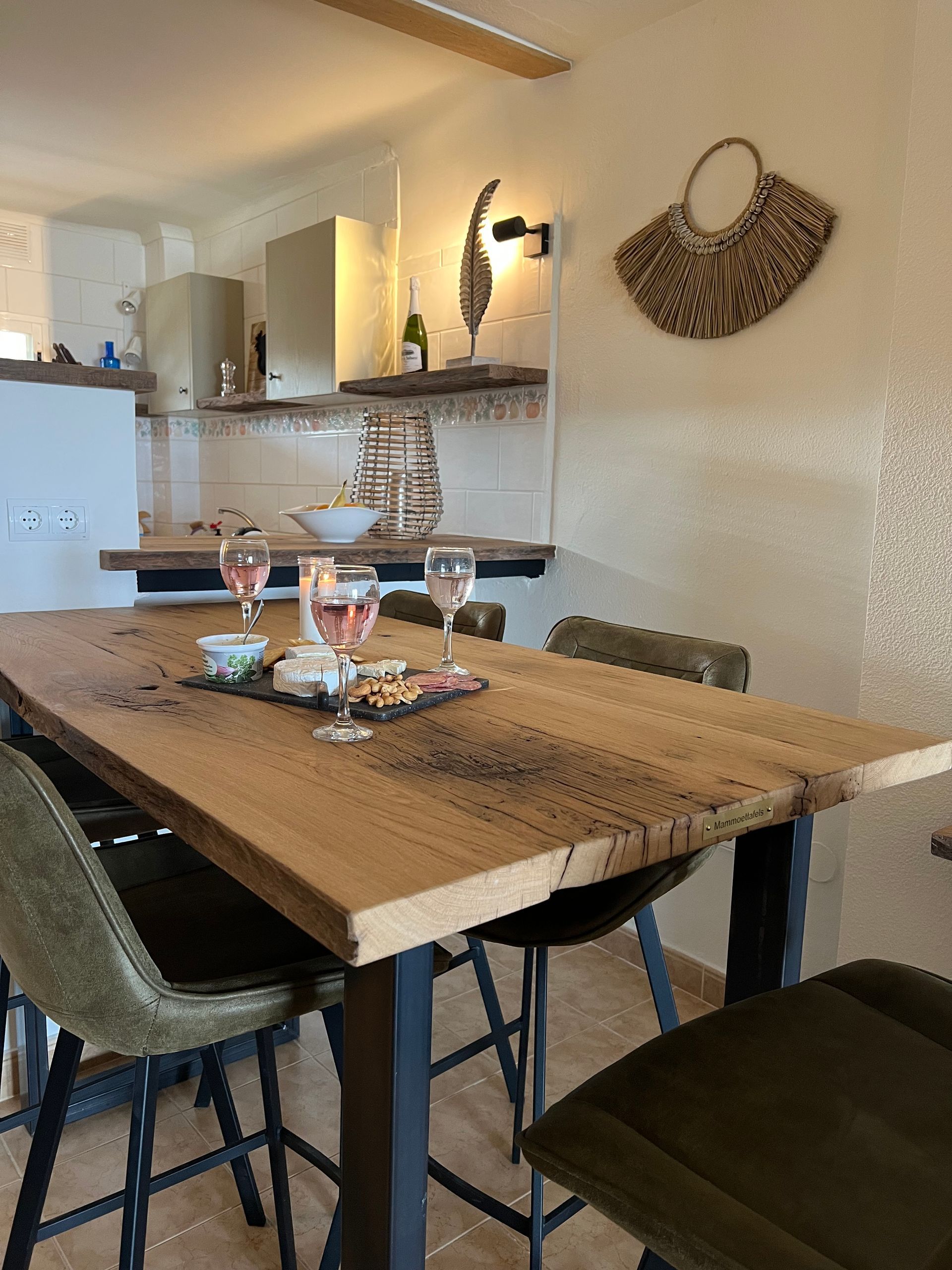 Mammoettafels heb staan. En laat er in dit appartement nou een toffe bartafel van Mammoettafels staan. Ken je Mammoettafels nog niet? Het concept van Mammoettafels vind ik uniek. Je kunt zelf de planken van je eettafel uitkiezen. Wil je minder knoesten of juist meer, ruw hout of meer geschuurd, lange tafel of toch liever wat korter, ronde vorm, ovaal of rechthoek echt alles is mogelijk. Dus om op Ibiza een tafel van Mamoettafels te zien staan was natuurlijk extra leuk!